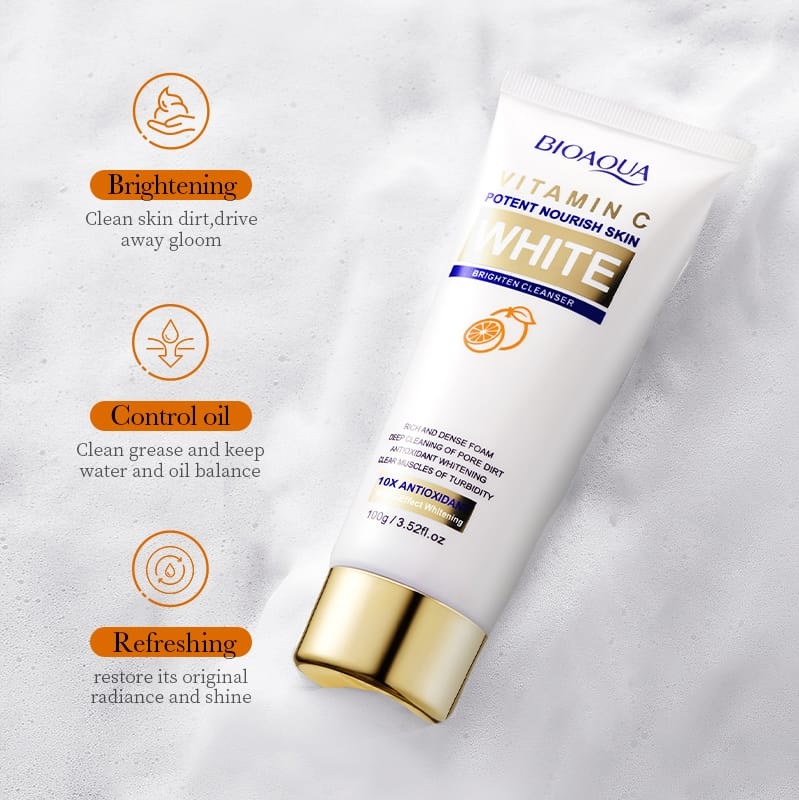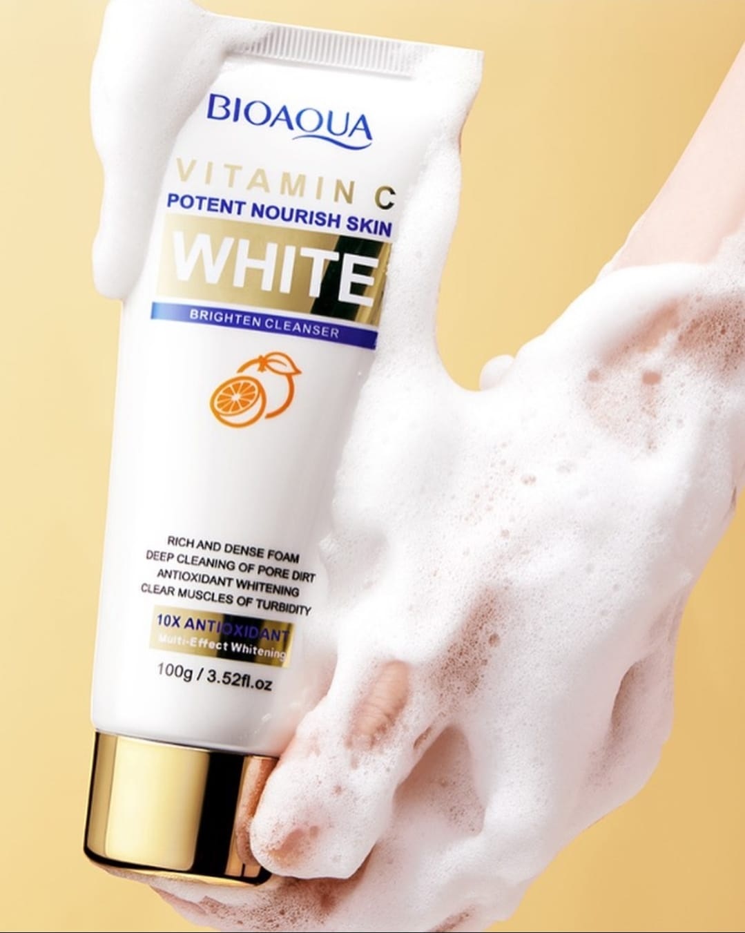 Aplique el jabón facial con vitamina C de Bioaqua, creando una espuma suave con las manos o una esponja.